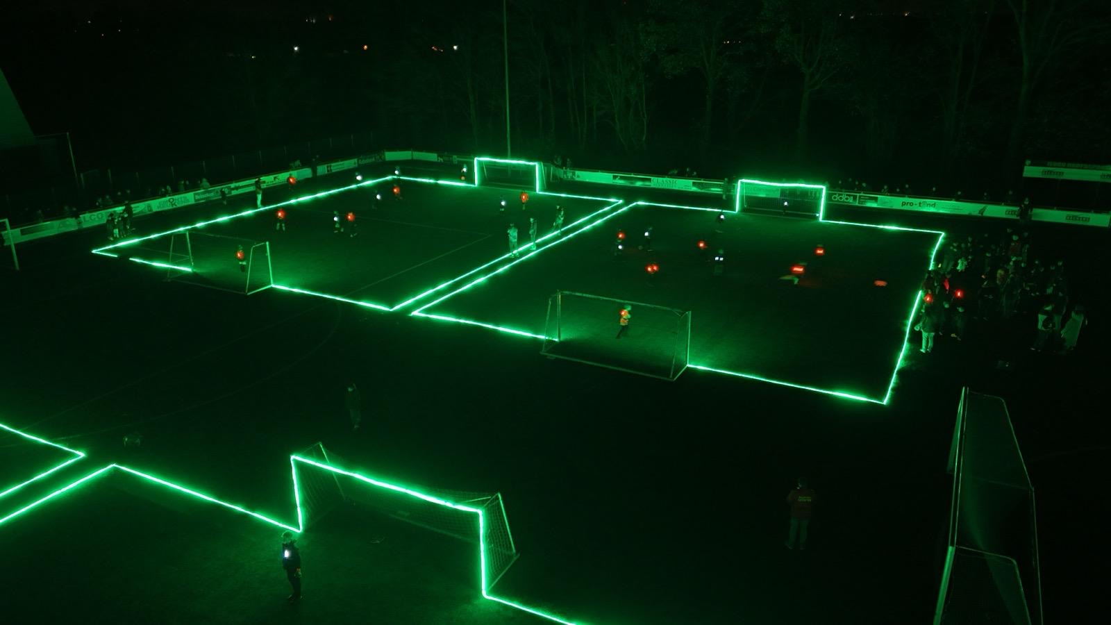 In het donker werd er gespeeld met lichtgevende hesjes, een LED-bal, en zelfs de belijning en doeltjes straalden in het licht. Het was een unieke ervaring waarbij snelheid, teamwork en vooral veel lachen centraal stonden.